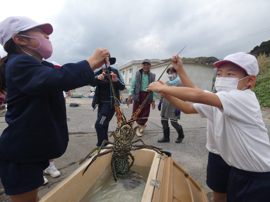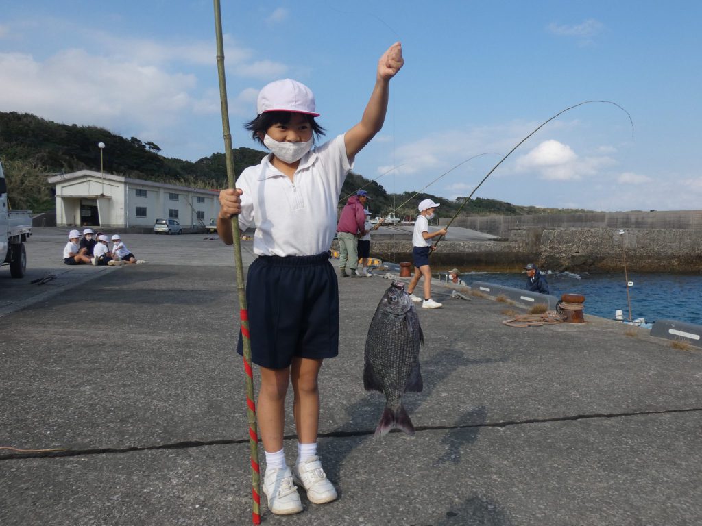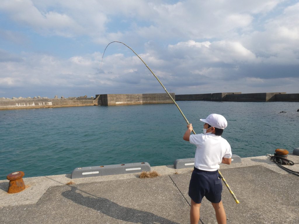 11月26日(木)。1・2年生は学校近くの浜脇港で魚釣り体験を行いました。以前1年生にお魚教室で魚や漁のことを教えてくださったふるさと先生が,お知り合いの方々と一緒に子供たちにも実際に魚を捕獲することを実感してもらいたいと,体験活動の場を設定してくださいました。