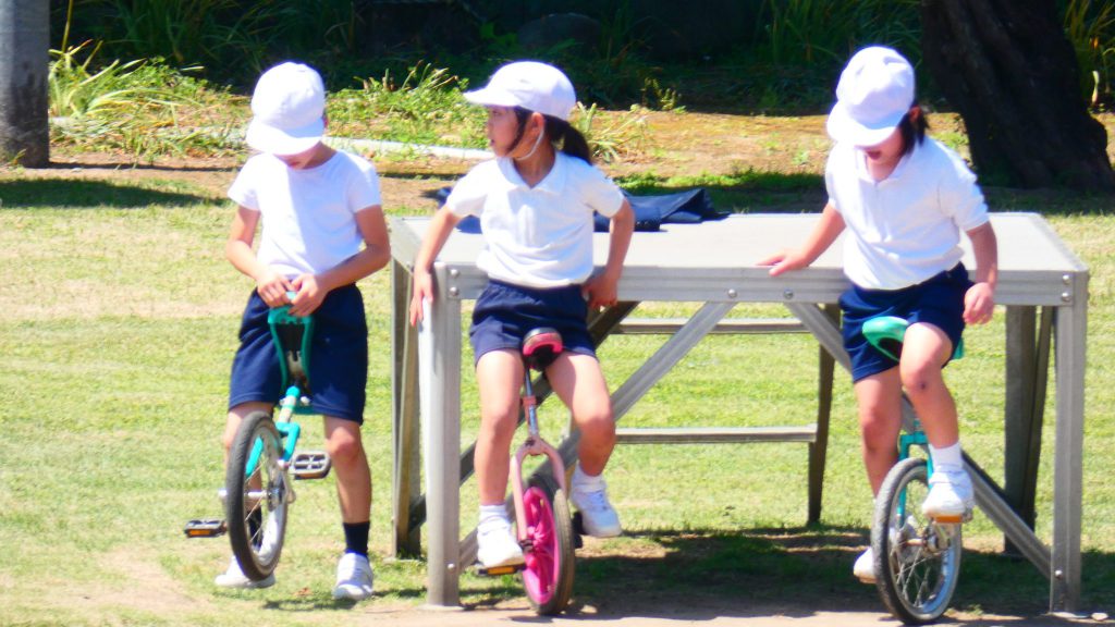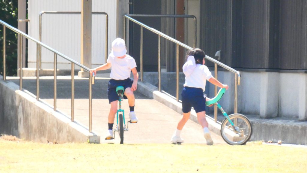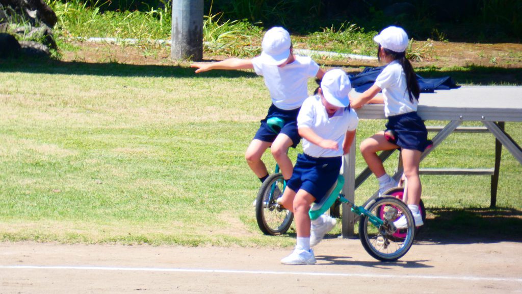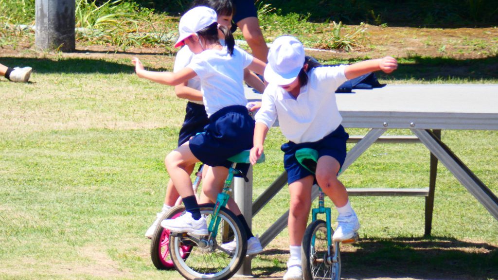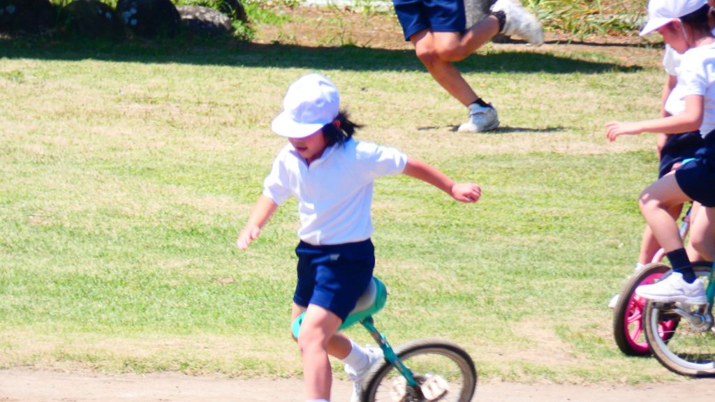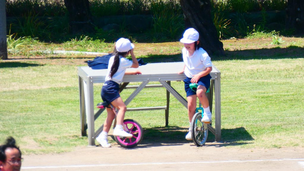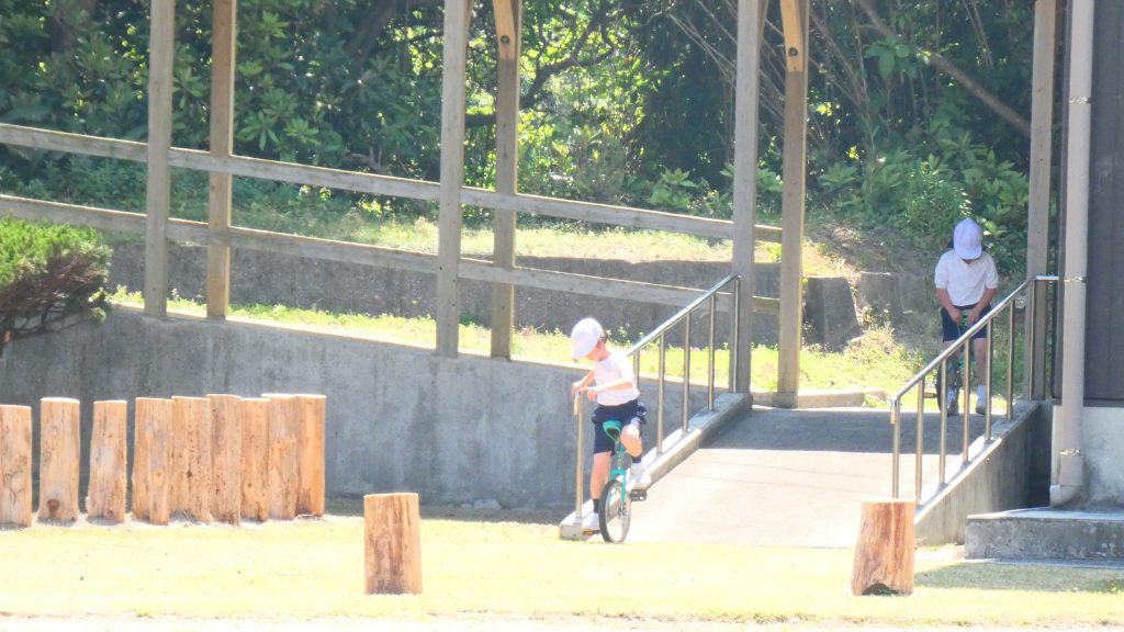 最後の連写の写真は2年生。補助具のところでよく3年生と練習していました。今日は,朝礼台のところからトラックを走る練習へチェンジ。バランスをとりながら15メートルほど進みました。これからどんどん距離が伸びると思います。1年生の先生と一緒に練習した成果が今も繋がっているようです。