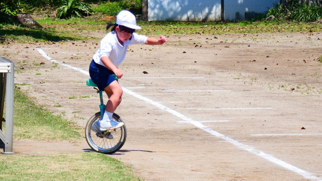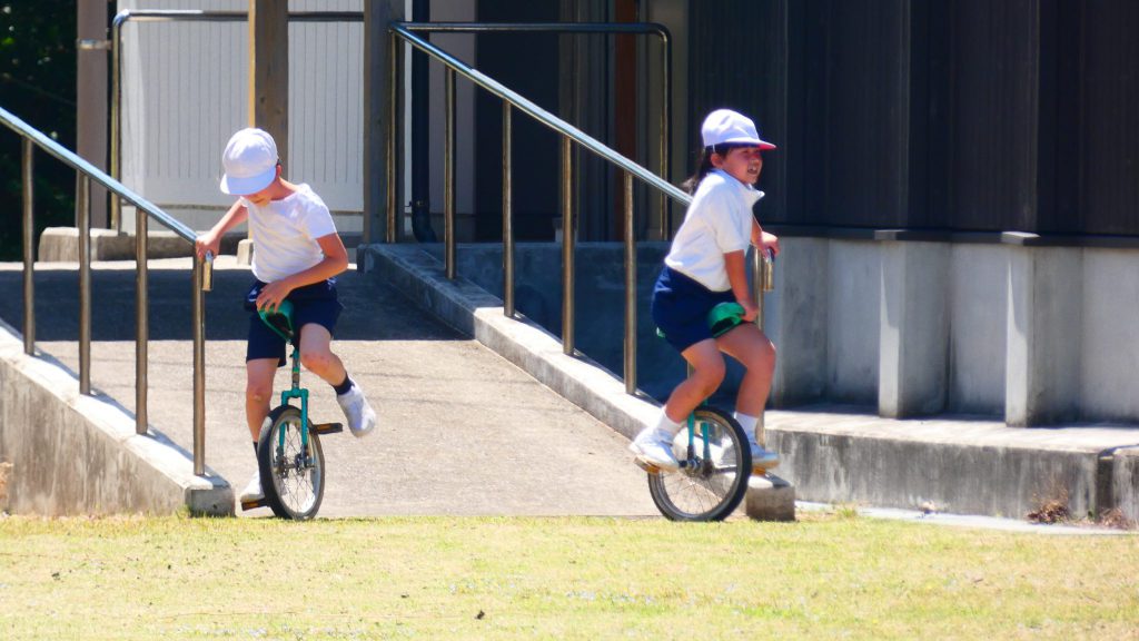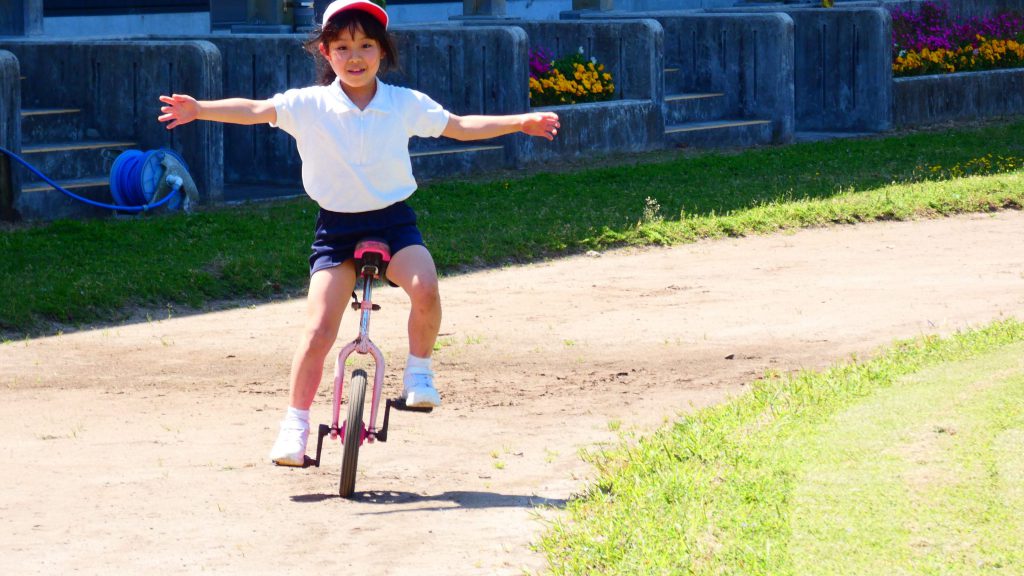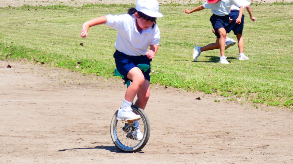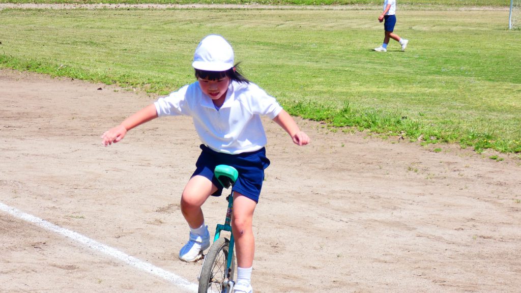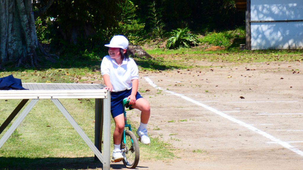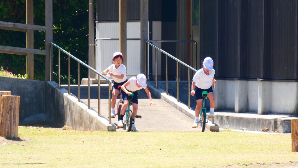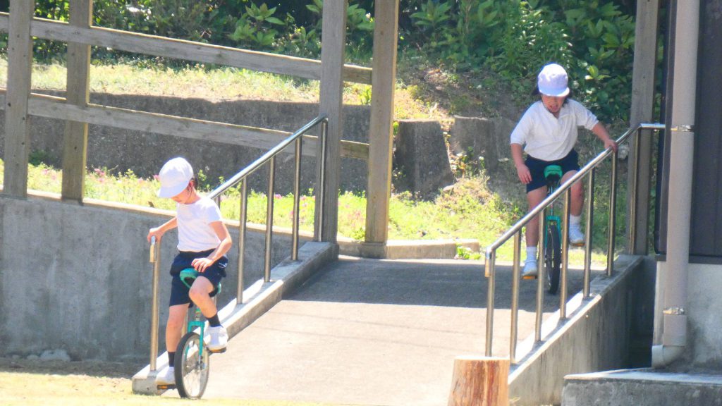 最後の連写の写真は2年生。補助具のところでよく3年生と練習していました。今日は,朝礼台のところからトラックを走る練習へチェンジ。バランスをとりながら15メートルほど進みました。これからどんどん距離が伸びると思います。1年生の先生と一緒に練習した成果が今も繋がっているようです。
