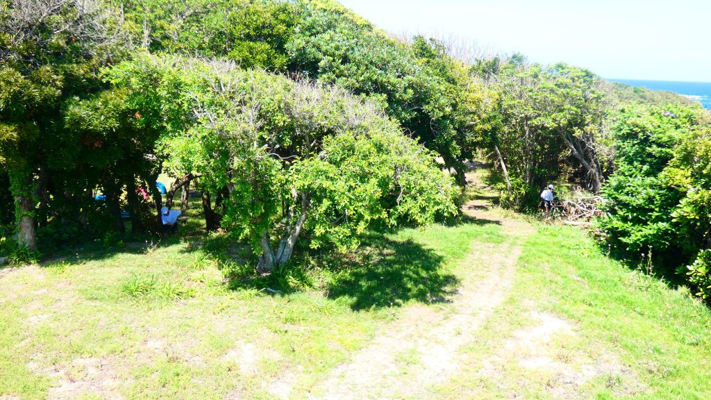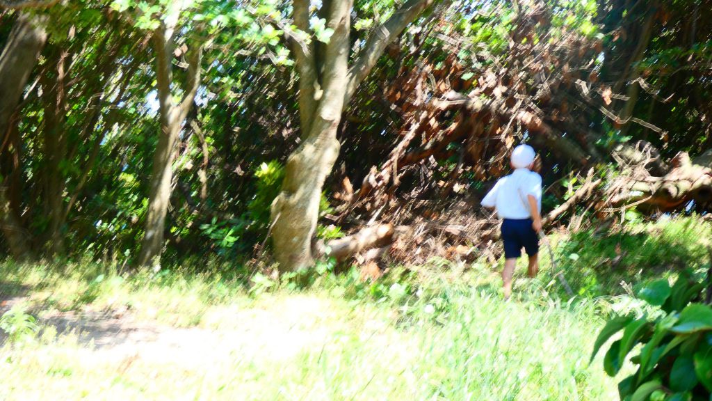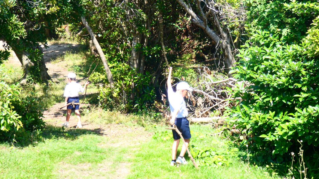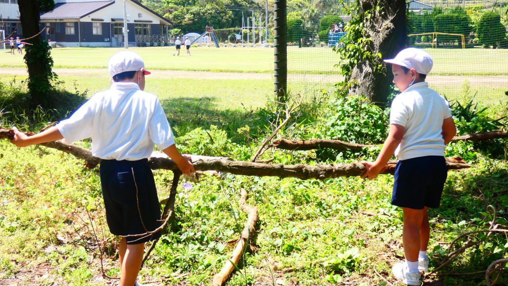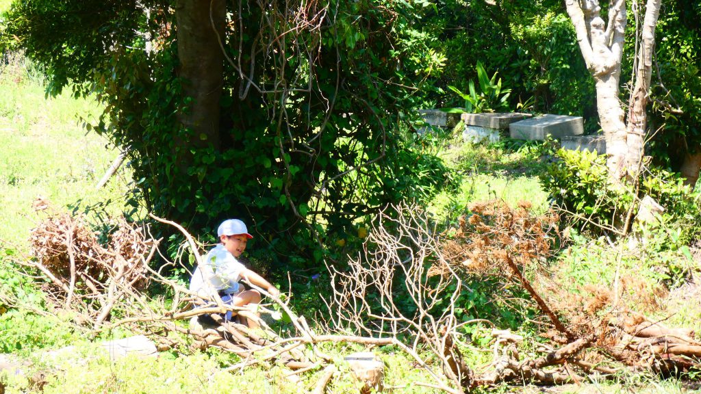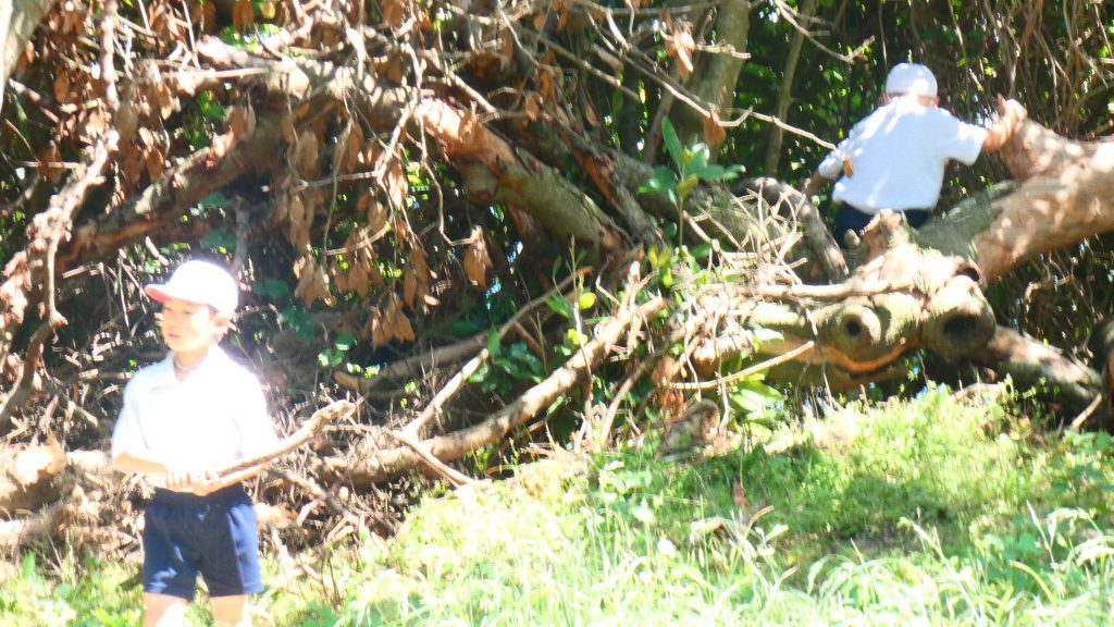 自然の森チームは現在我が家を建設中のこと。壁(枠組み)をつくり、途中家の中で休憩していました。
