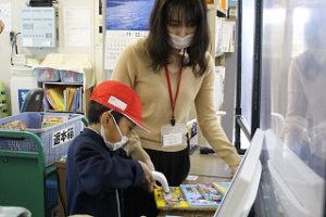 「小学校にはない本がたくさんあるね。」「本を探すこともできるんだね。」と大喜びです。