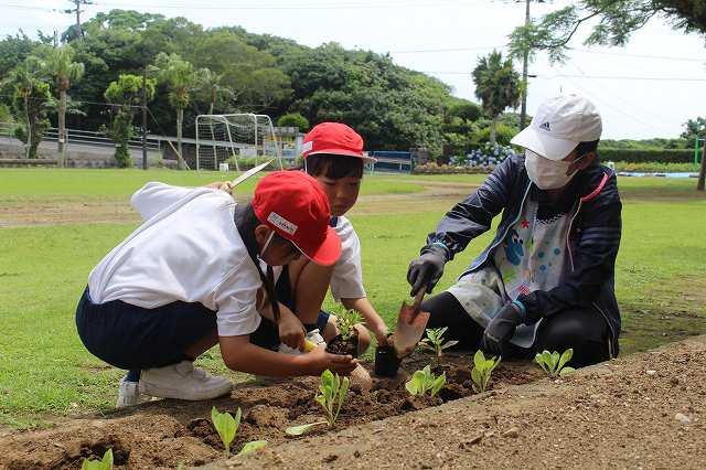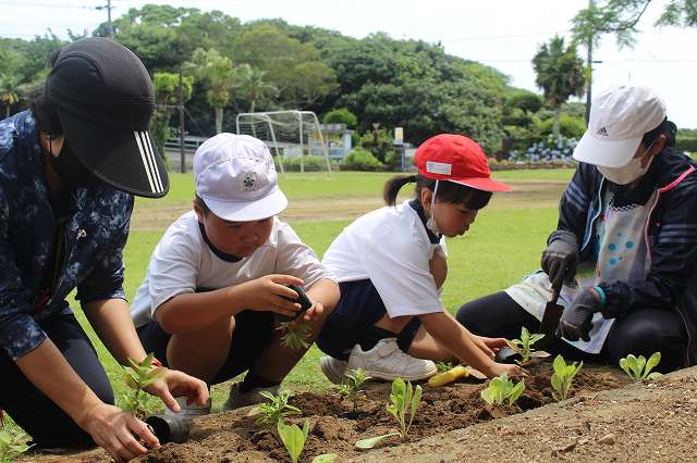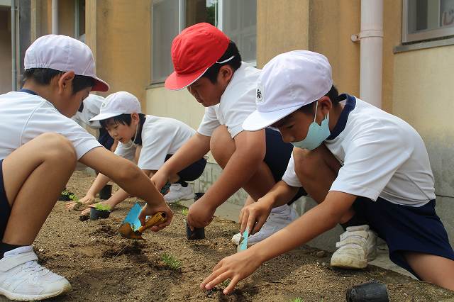 本日は,清掃時間から5時間目にかけて全児童で花の苗植えを行いました。
