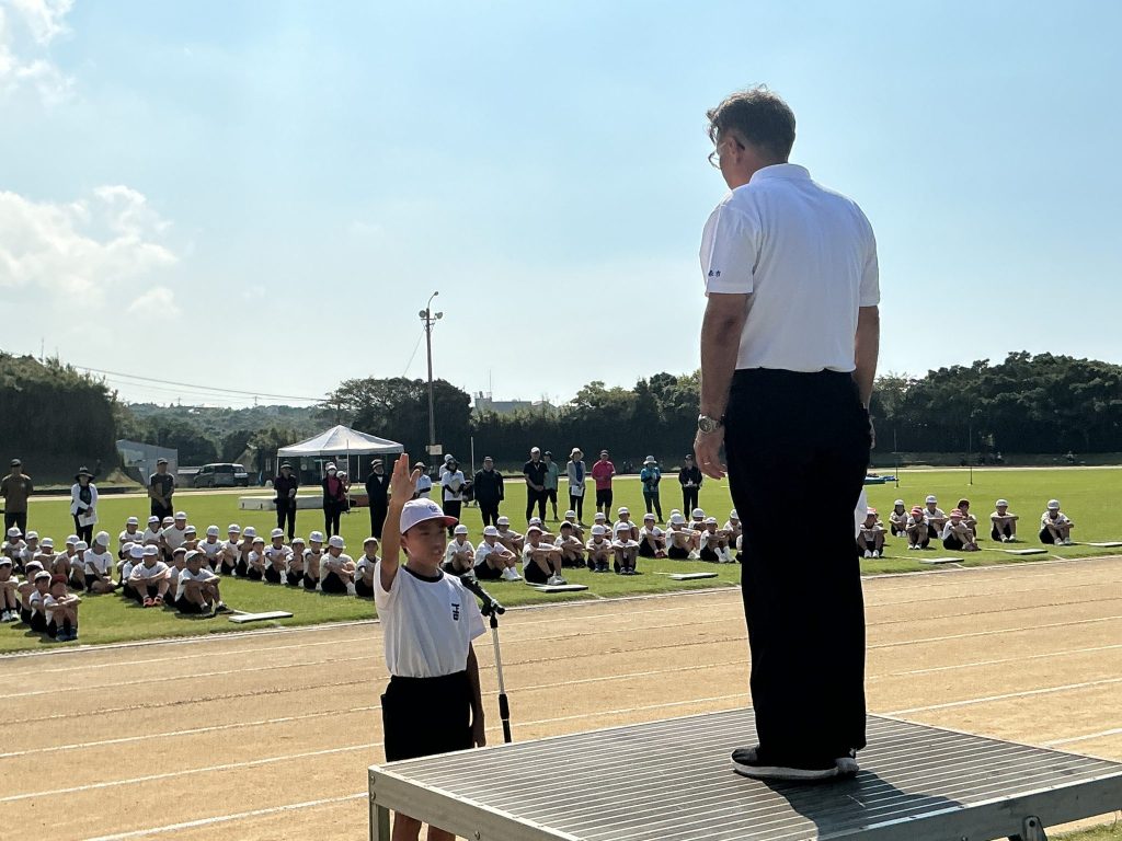 秋晴れの空の下、本校の児童が児童代表として選手宣誓を行いました。