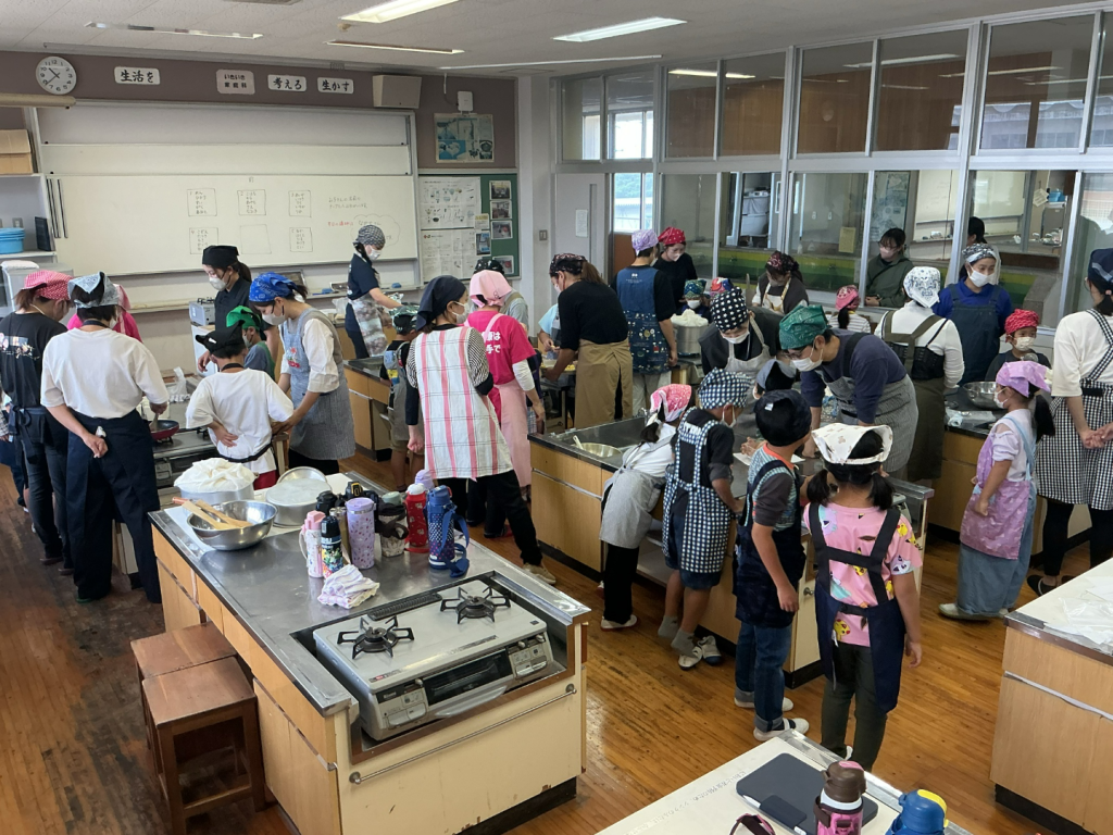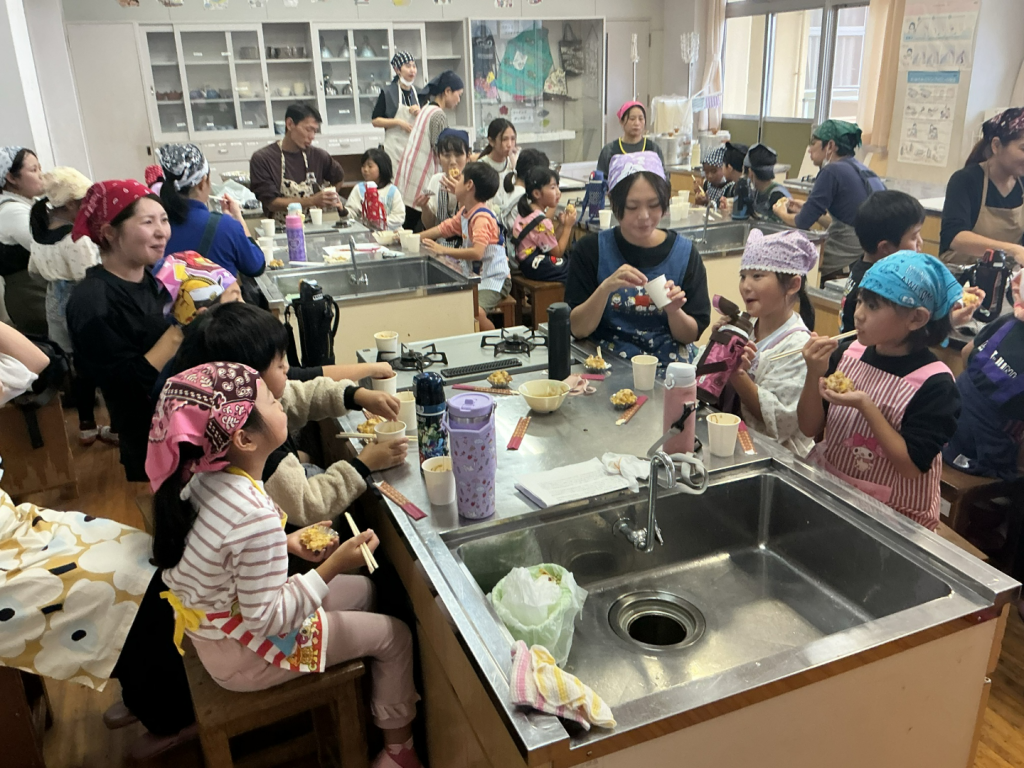 調理には、講師の方を招き、保護者の方々にもご協力いただき、家庭科室は笑顔と甘い香りに包まれました。メニューは、「さつまいもの黒糖おにまんじゅう」と「さつまいも団子」。黒糖のやさしい甘さと、さつまいもの自然な風味が絶妙にマッチし、子どもたちも「おいしい!」と大満足の様子でした。