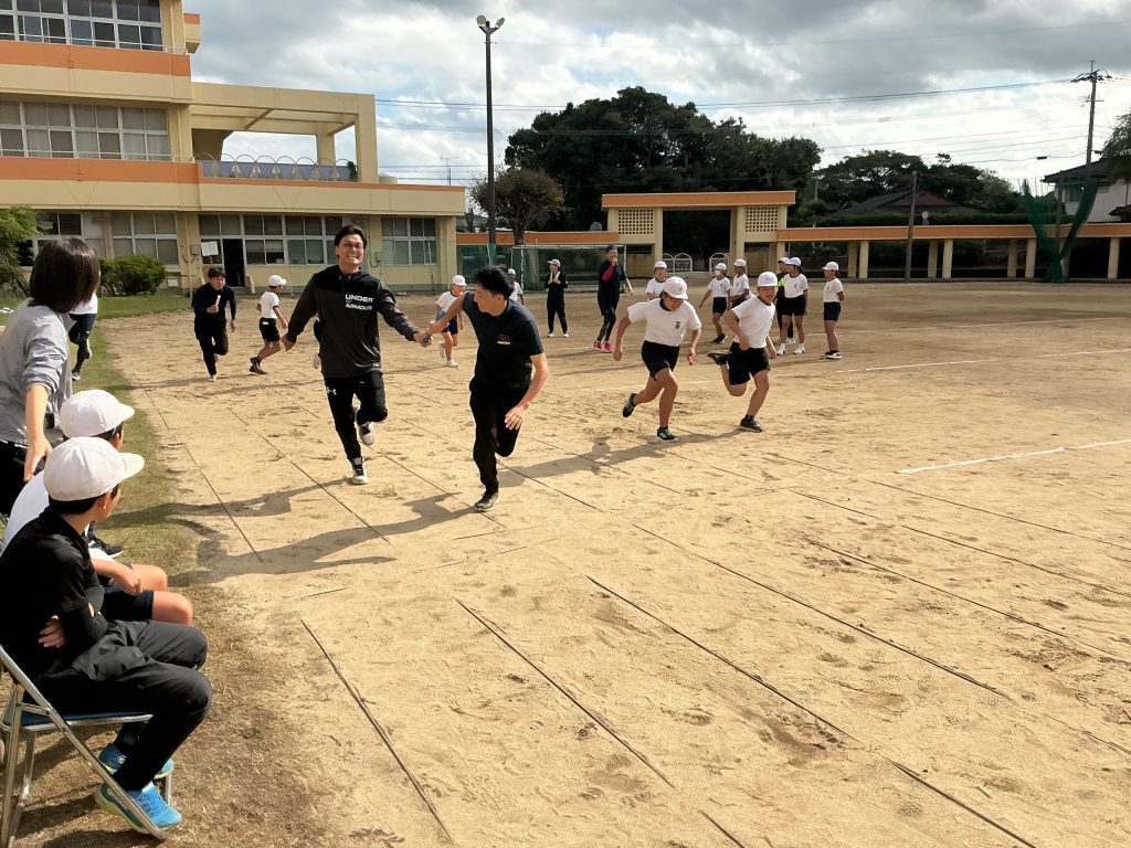 「リレー競技」もあり児童チームとPTA保体部の保護者&先生チームが熱戦を繰り広げました。高齢者の皆さんも、児童の元気な走りに拍手を送りながら、笑顔で見守ってくださいました。