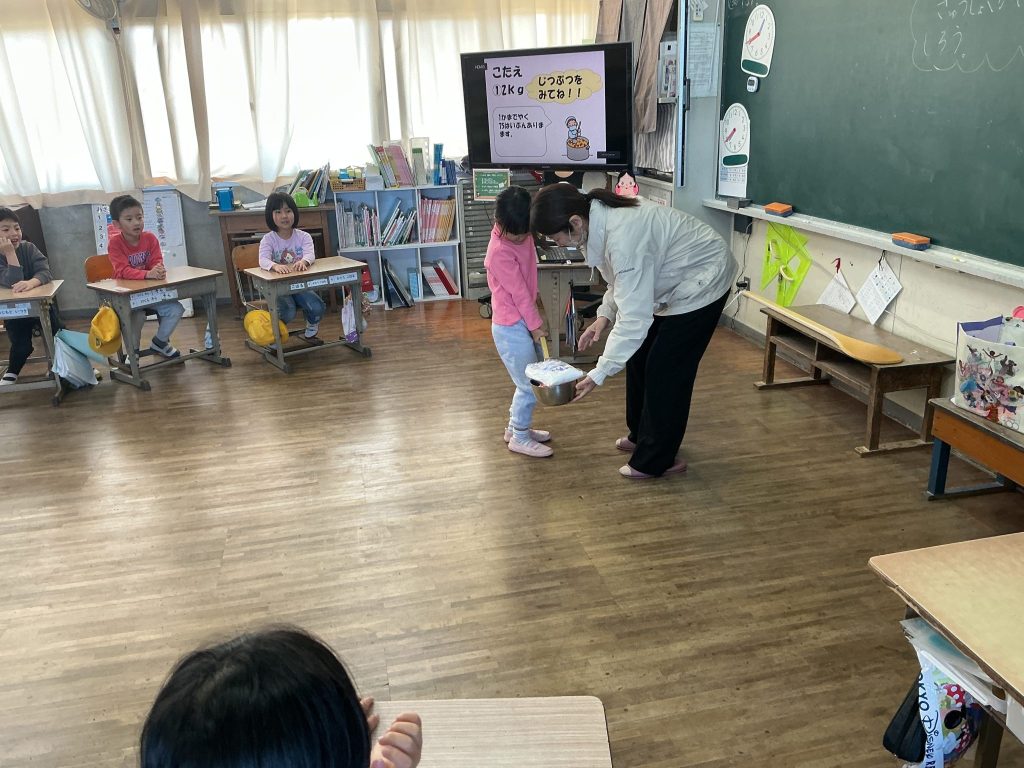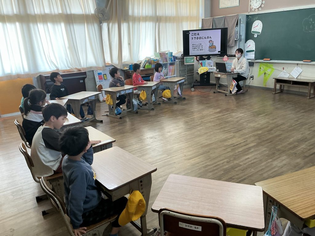 1年生を対象に、食に関する指導が行われました。今日は栄養教諭の先生が来校し、給食がどのように作られているのかを、クイズやしゃもじの実物等を使いながら、わかりやすく教えてくださいました。