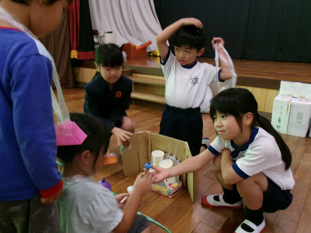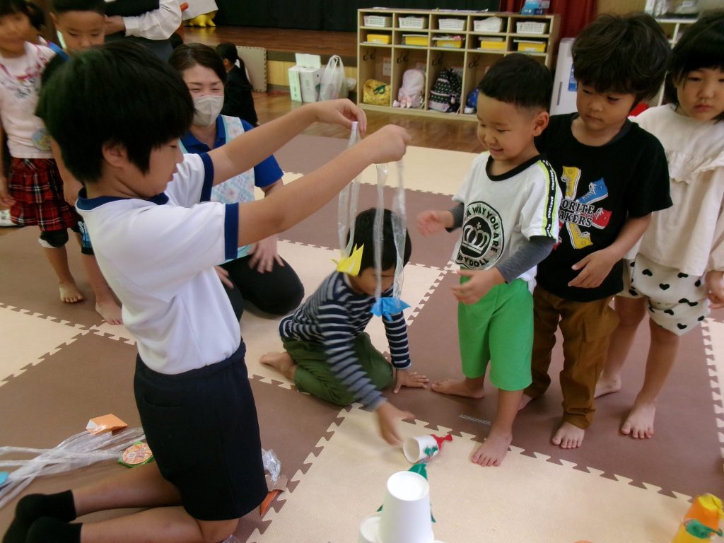 1・2年生は,魚つりやさん・コロコロシュートやさん・玉入れやさん・こまやさん・的当てやさん・輪なげやさんの準備をし,園児たちにおもちゃの遊び方を説明したり,一緒に遊んだりしました。