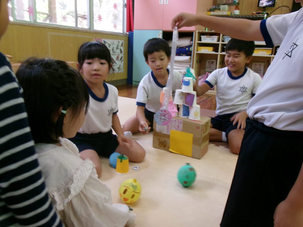 生活科で作ったおもちゃで,住吉さくら保育園の子供たちと交流会をしてきました。