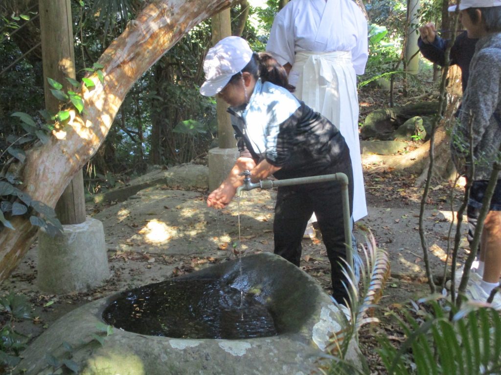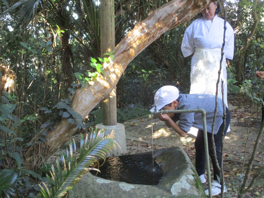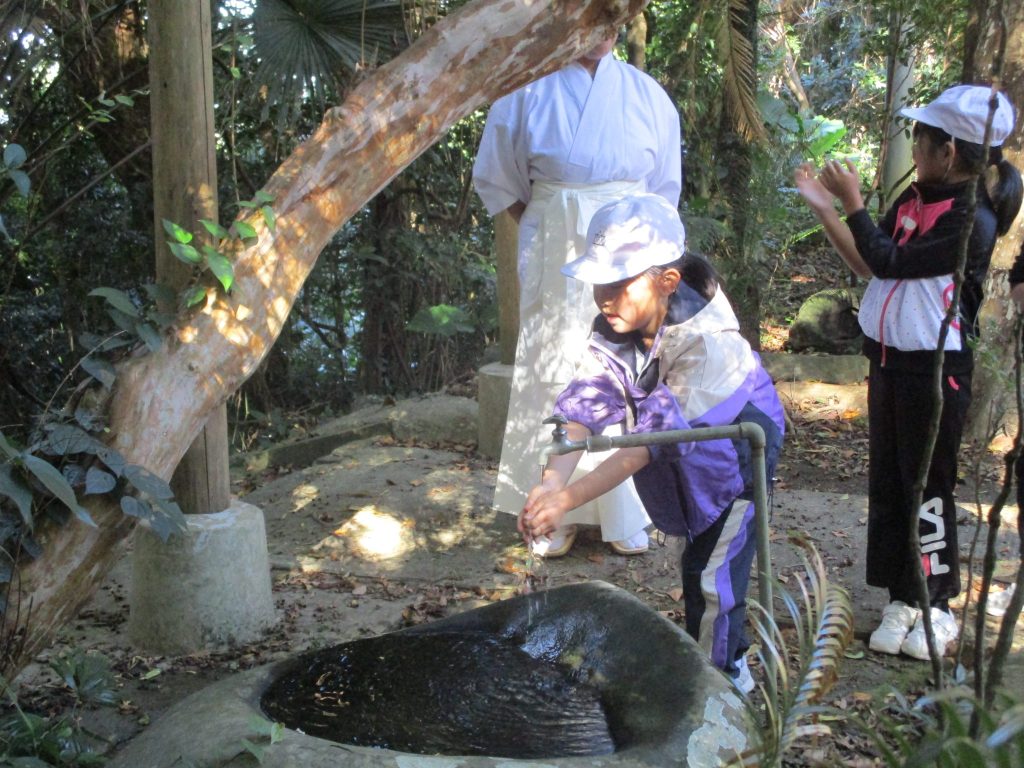 住吉神社に着くと神主の上妻さんにお清めなどの作法を教えてくださいました。その後,3班に分かれて落ち葉を集めました。