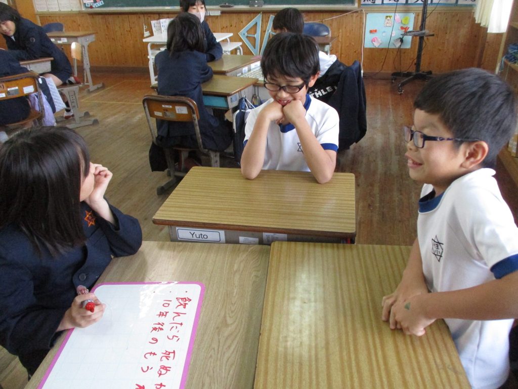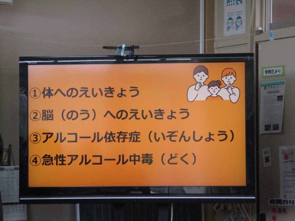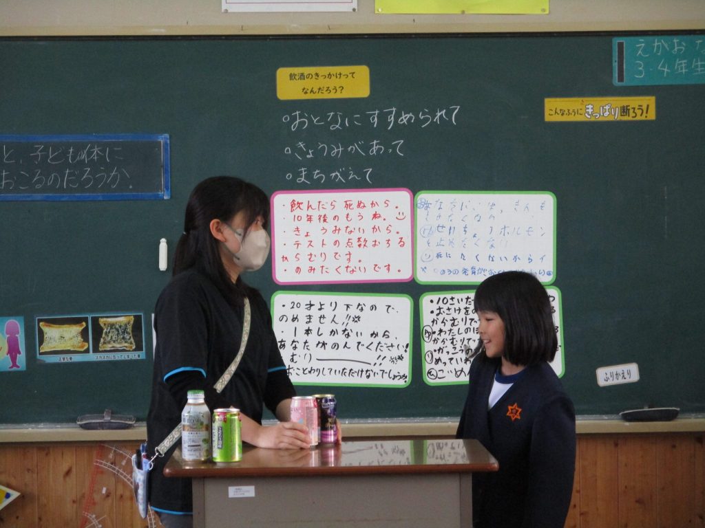 12月17日(水)3校時、3・4年生を対象に飲酒防止教室を実施しました。養護教諭の古賀先生が,アニメ動画を使って子供が飲酒してはいけない理由をわかりやすく説明してくださいました。後半は,お酒を勧められたときの断り方についてグループで話し合い,一人一人,自分なりの断り方について発表しました。「お酒は,20歳から」