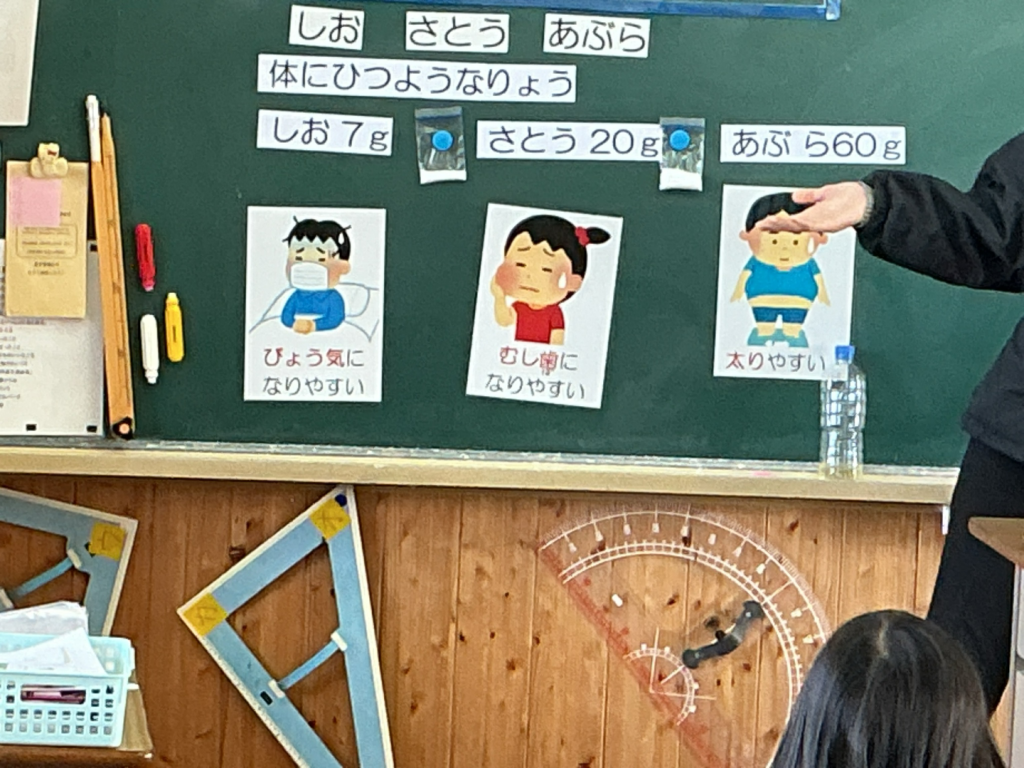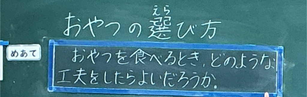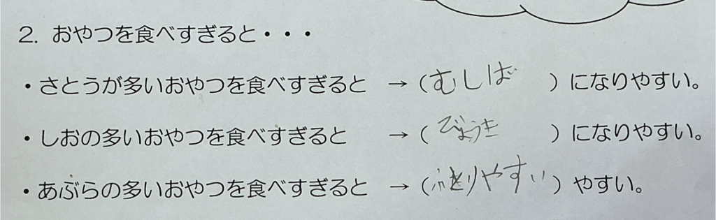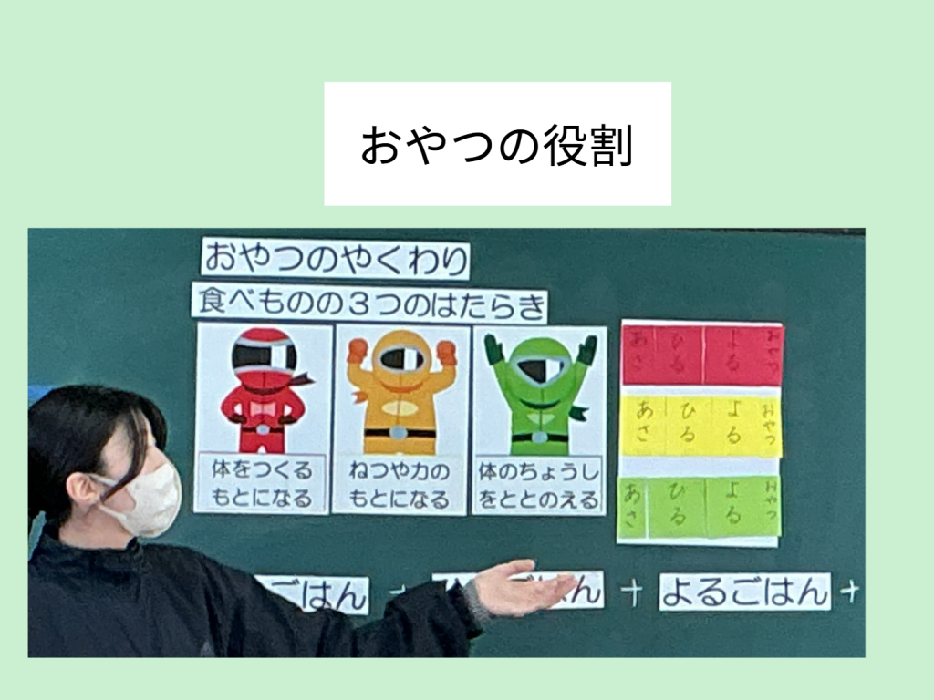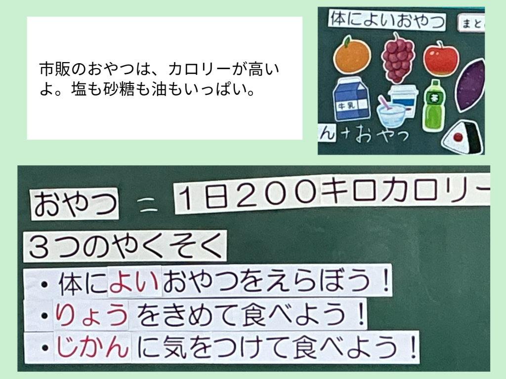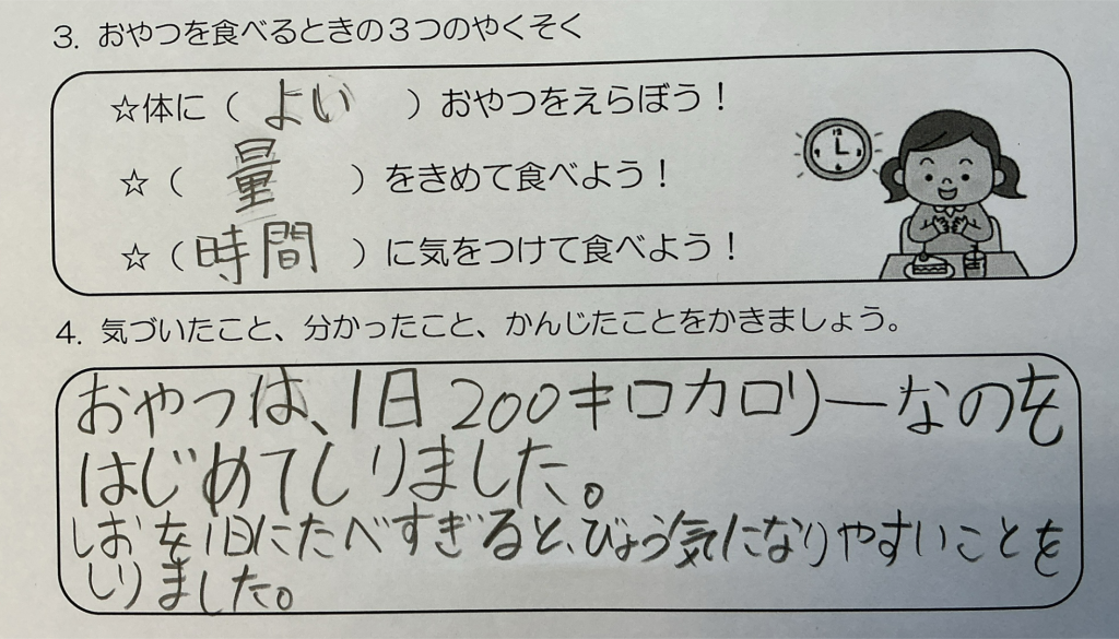おやつの働きと,おやつを食べるときの3つの約束を知りました。