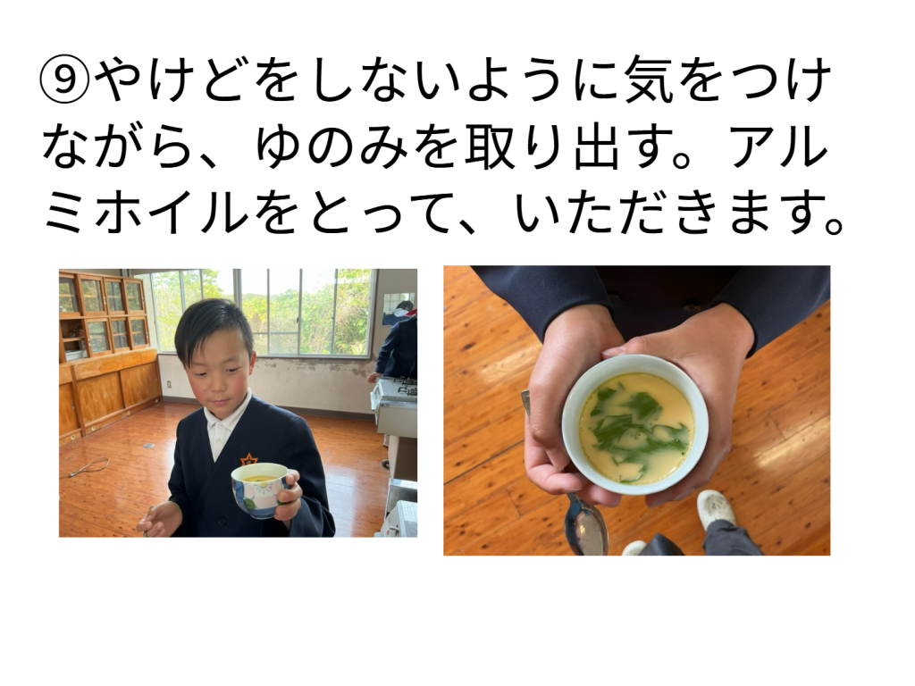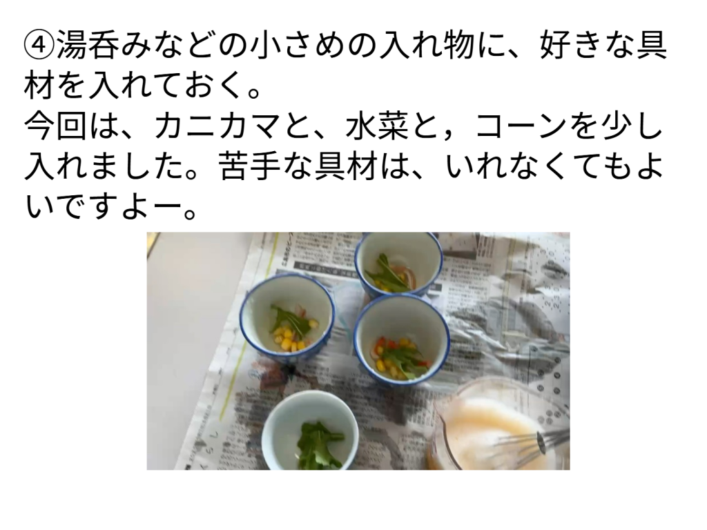4年生は,理科の時間に「水のすがたと温度」の学習の中で,沸騰した時の水蒸気の力を利用して蒸し料理ができることを学びました。そこで,実際に茶碗蒸しを作ってみました。